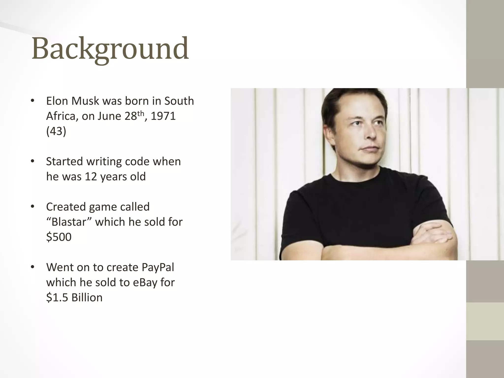 Elon Musk is a South African-born entrepreneur and engineer who co-founded PayPal, Tesla Motors, and SpaceX. He started programming at age 12 and sold his first software at age 17. Currently, Musk serves as CEO of Tesla Motors, SolarCity, and SpaceX, working to advance electric vehicles, solar energy, and space travel through reusable rockets. The document outlines Musk's background and accomplishments, emphasizing his passion for pushing technological boundaries across industries to change the future.