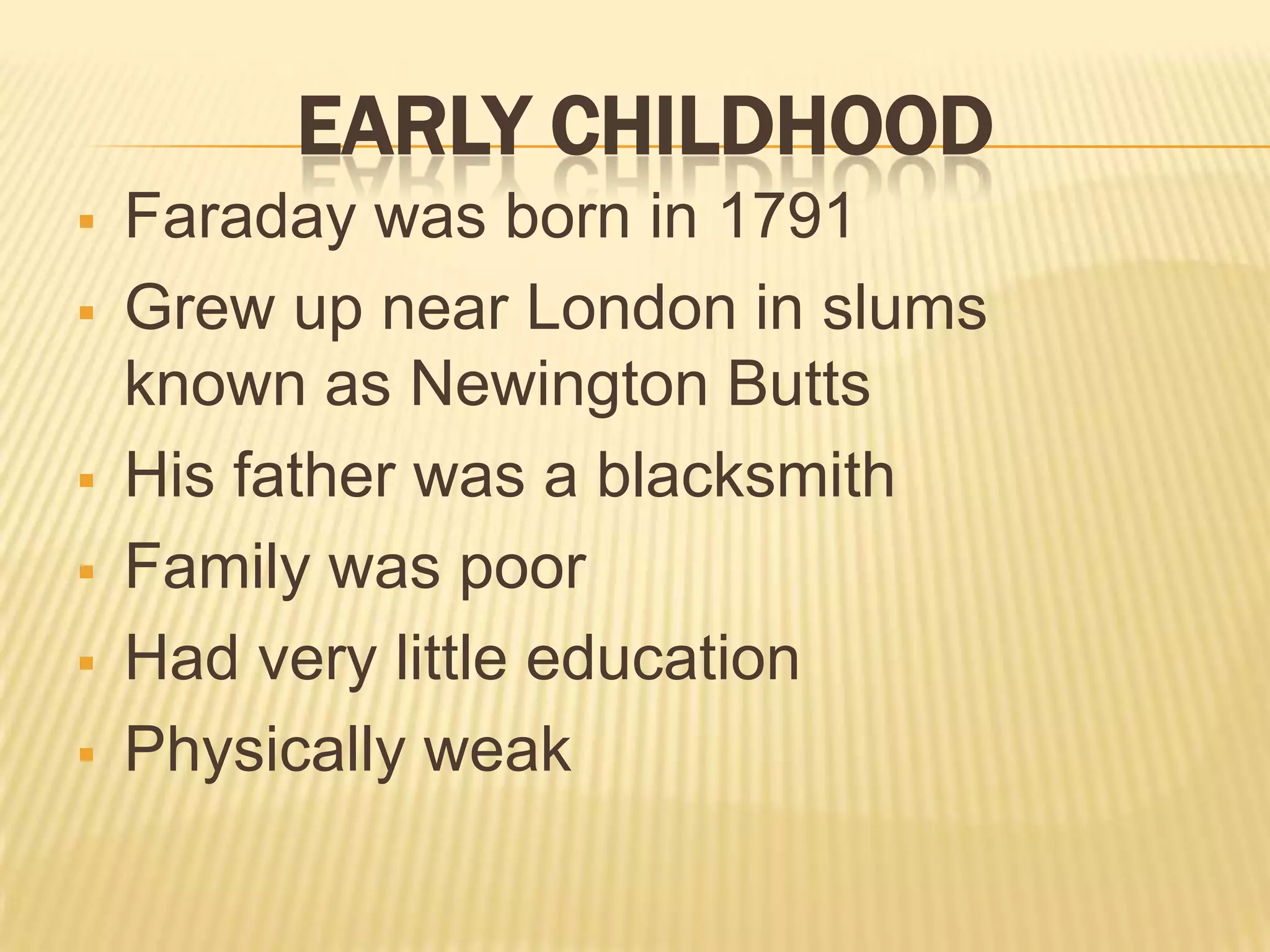 Michael Faraday was born in 1791 in London to a poor family. He had little formal education but showed an interest in science through his work as a bookbinder. He became an assistant to scientist Humphry Davy at the Royal Institution, where he began his research into electricity and magnetism. Through experiments with coils and iron rings, he discovered the principles of electromagnetic induction and how changing magnetic fields can generate electric currents. His invention of the electric generator in 1831, which used a copper disk between magnet poles to produce a continuous electric current, allowed electricity to be efficiently produced and paved the way for widespread electrification.