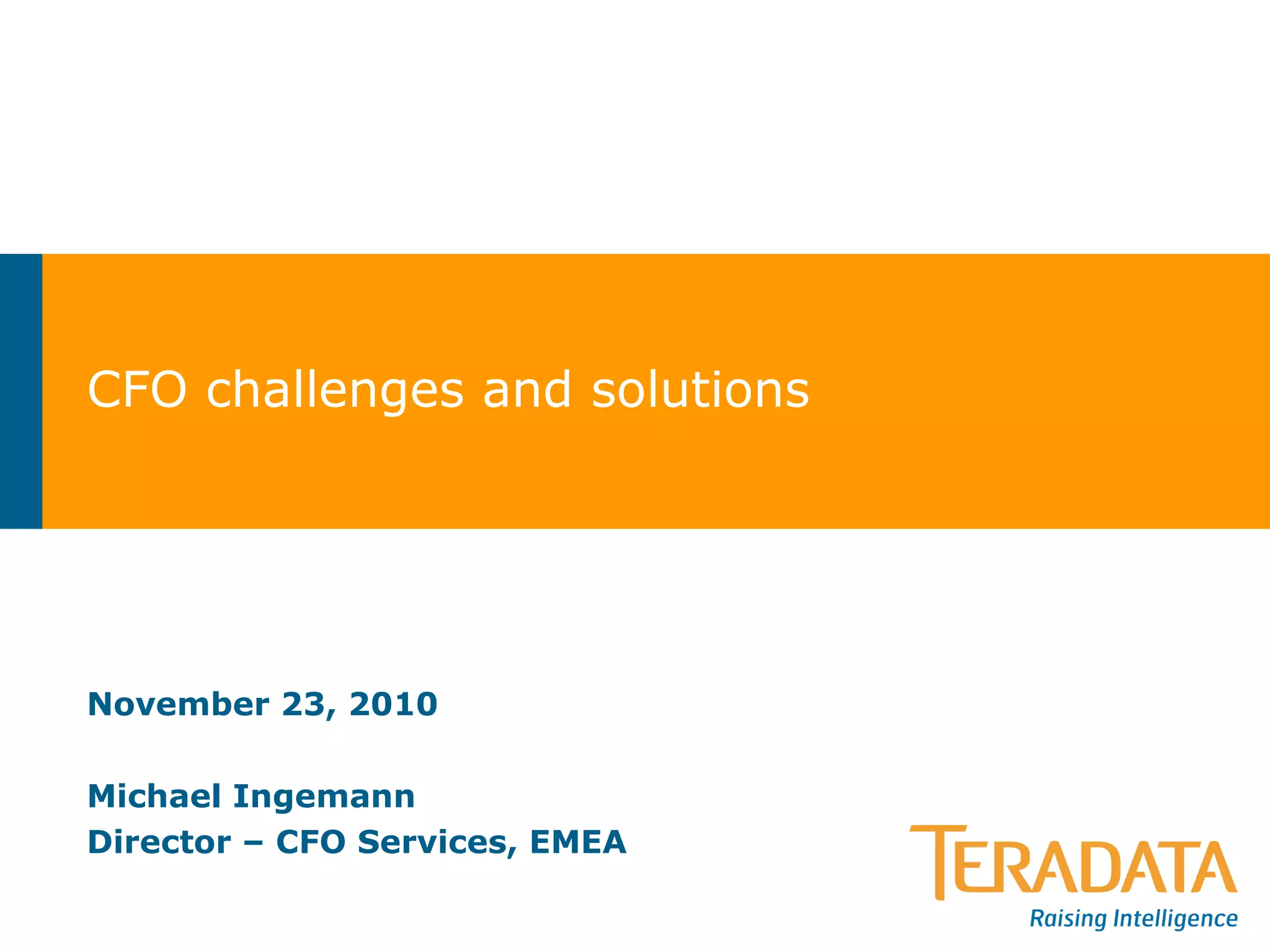 The document discusses several challenges facing CFOs and finance organizations, including: evolving regulatory requirements, differing accounting standards, fragmented data sources, and the need for improved performance management and reporting. It outlines key capabilities needed for finance organizations to succeed, such as speed, flexibility, alignment, and focus. Architectural complexity from multiple legacy systems, ERPs, and data silos also makes transforming finance organizations difficult. The document provides examples of how companies have implemented Teradata solutions to improve profitability analysis, transaction processing, and customer insights.
