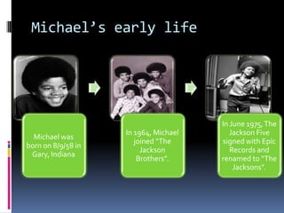 Michael Jackson was born in 1958 in Indiana and began his music career in the early 1960s as part of The Jackson 5. He went on to have a successful solo career throughout the 1980s. Michael underwent many plastic surgeries and faced accusations of child sexual abuse in the 1990s and 2000s. He continued making music and performing until his death in 2009 at age 50.