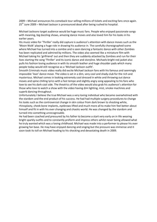 Michael Jackson was a hugely successful pop star who began his career at a young age with the Jackson 5. Some of his biggest hits included "Thriller", "Beat It", and "Billie Jean". However, his personal life was troubled, including accusations of child abuse and struggles with his public image and identity. After his death in 2009, parodies of Jackson emerged online and in television shows, though some were disrespectful. His music videos, like "Thriller", helped captivate audiences with dance moves and storylines.