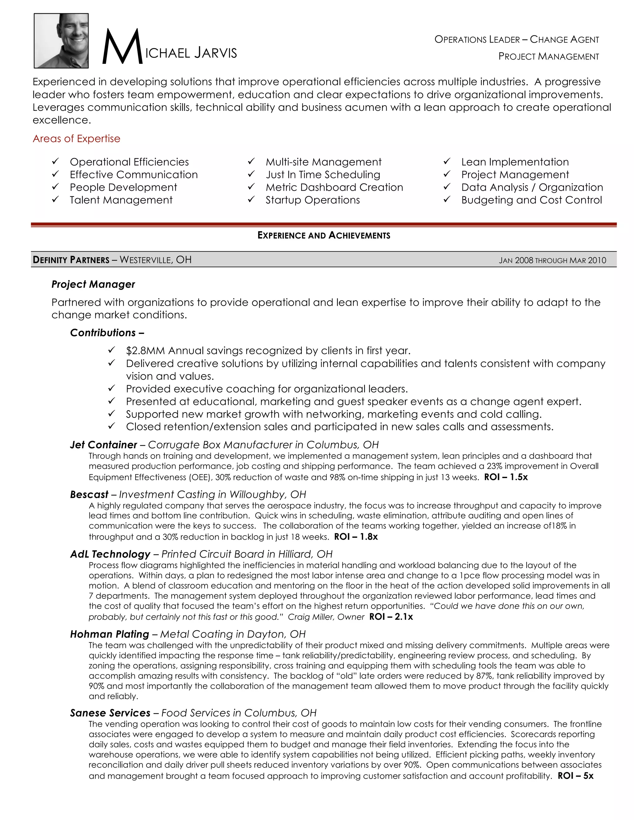 Michael Jarvis has over 15 years of experience leading operations and implementing lean practices to drive efficiencies and improvements. He has a track record of reducing costs by 30% while increasing throughput by 18% and reducing backlogs by 30% for clients. As an operations leader, he fosters team empowerment and communication to achieve goals like same day shipping improvement from 80% to 95% and inventory variation reduction of over 90%. His expertise lies in operational efficiencies, lean implementation, project management, and people development.