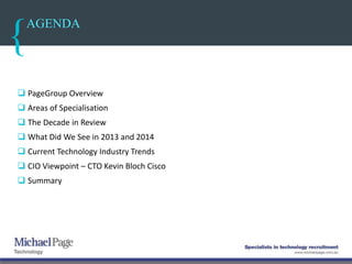 The document, presented by Emily Wilson and George Kauye, provides an overview of the employment landscape in the technology sector, highlighting trends from 2013 and projections for 2014. It notes a flat employment market influenced by global economic conditions, particularly in Australia, and presents insights into the demand for ICT jobs and emerging technology needs. The report suggests cautious optimism moving forward, emphasizing the importance of effective recruitment strategies and retention measures in a competitive job market.