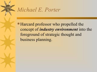 Michael Porter developed the Five Forces model for analyzing industry competition and profitability. The five competitive forces are: 1) rivalry among existing competitors, 2) threat of new entry, 3) threat of substitute products, 4) bargaining power of suppliers, and 5) bargaining power of buyers. The model helps evaluate an industry's attractiveness by examining the strength of each force and impact on profitability. Determinants that influence the competitive forces are also identified such as barriers to entry, supplier/buyer concentration, and product differentiation.