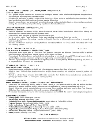 Michael Rice is a senior instructional designer with over 20 years of experience developing training programs and materials. He has extensive expertise in instructional design, technical communication, and creating online and accessible courses. Rice seeks a position as a training content developer, technical writer, or instructional designer to utilize his skills and continue professional growth. He has worked for companies such as Costco, Boeing, Liberty Mutual, and Amazon, developing e-learning and in-person trainings across various industries.
