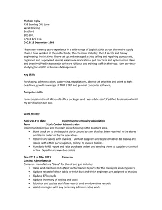 Michael Rigby has over 20 years of experience in logistics and supply chain roles across various industries. He is currently studying for a HNC in Business Management. His experience includes setting up and managing a computer shop, organizing warehouse relocations, implementing systems and software rollouts, and stock control roles. He is proficient in Microsoft Office and was previously Microsoft Certified. In his spare time he enjoys motorcycling, rugby, and is a Christian.