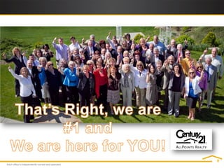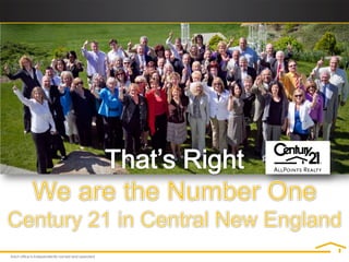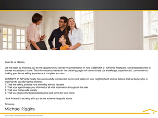 Century 21 AllPoints Realty proposes a 21 step marketing plan to sell a home. Key aspects include setting a fair price using a comparative market analysis, preparing the home for showings, heavy online advertising given 90% of buyers search online, holding open houses, and negotiating offers. The plan aims to sell the home quickly at the best possible price through professional listing, photography, flyers, open houses, and digital and social media marketing.