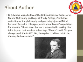 This document summarizes G.E. Moore's background and reputation for honesty. It states that Moore was a Fellow of the British Academy, professor of mental philosophy and logic at Trinity College, Cambridge, and editor of the philosophy journal Mind. It also quotes Bertrand Russell saying that he had only succeeded once in getting Moore to tell a lie, by using a subterfuge when asking if Moore always told the truth.