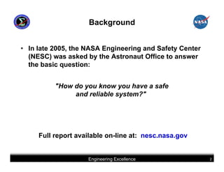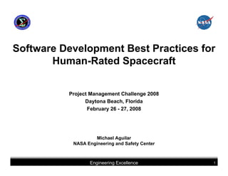 This document summarizes best practices for software development for human-rated spacecraft. It discusses approaches to increasing software reliability through defect prevention and fault tolerance. It also outlines key aspects of an ideal software development process including requirements analysis, architectural design, detailed design, coding, testing and integration. Finally, it discusses considerations for requirements validation and verification, requirements management, and software architectural trades.