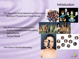 Social networking sites allow people to share experiences and stories through new forms of online communication. This blurs distinctions between physical and virtual worlds as people increasingly live hybrid digital and offline lives. Such sites provide spaces for self-expression and community building around shared interests. They also incorporate elements of games through reward systems that keep users engaged. Going forward, social networking is likely to proliferate and blur boundaries further as broadcast and games converge, giving people more ways to both consume and actively participate in interactive narratives across physical and digital spaces.