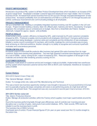 Michael Combe has over 35 years of experience in management roles in sales and operations. He has a proven track record of turning around underperforming businesses and improving profits. Some of his accomplishments include improving a company's operating profits by £10m over 18 months through restructuring operational functions and implementing changes. He also increased another company's food service business revenues from £2.5m to £12m by developing new product lines and innovating. Combe has experience setting up greenfield sites on schedule and budget in multiple countries.