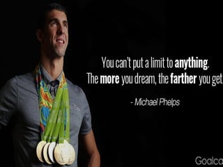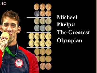 Michael Phelps is considered the greatest Olympian of all time. He was born in 1985 in Baltimore, Maryland and was diagnosed with ADHD as a child. He started swimming at age 7 influenced by his mother and sisters. By age 10, he held a national record for his age group. At the 2000 Olympics at age 15, he became the youngest male U.S. Olympian in 68 years. Phelps went on to win 28 medals, including 23 gold, over five Olympic games, setting numerous world records in the process. He is the most decorated Olympian of all time.