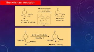 This document summarizes advancements in organocatalytic Michael additions. It describes the original Michael reaction and mechanism. Enamine/iminium catalysis is discussed, along with examples of aromatic and heteroatom nucleophiles in asymmetric Michael reactions. Michael cascades involving aldol reactions are also summarized. The document outlines reductive Michael additions and cascades catalyzed by iminium ions. Finally, it summarizes the development of asymmetric hetero-Michael reactions involving sulfur, oxygen, and nitrogen nucleophiles.