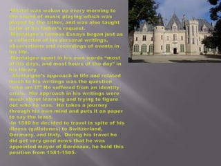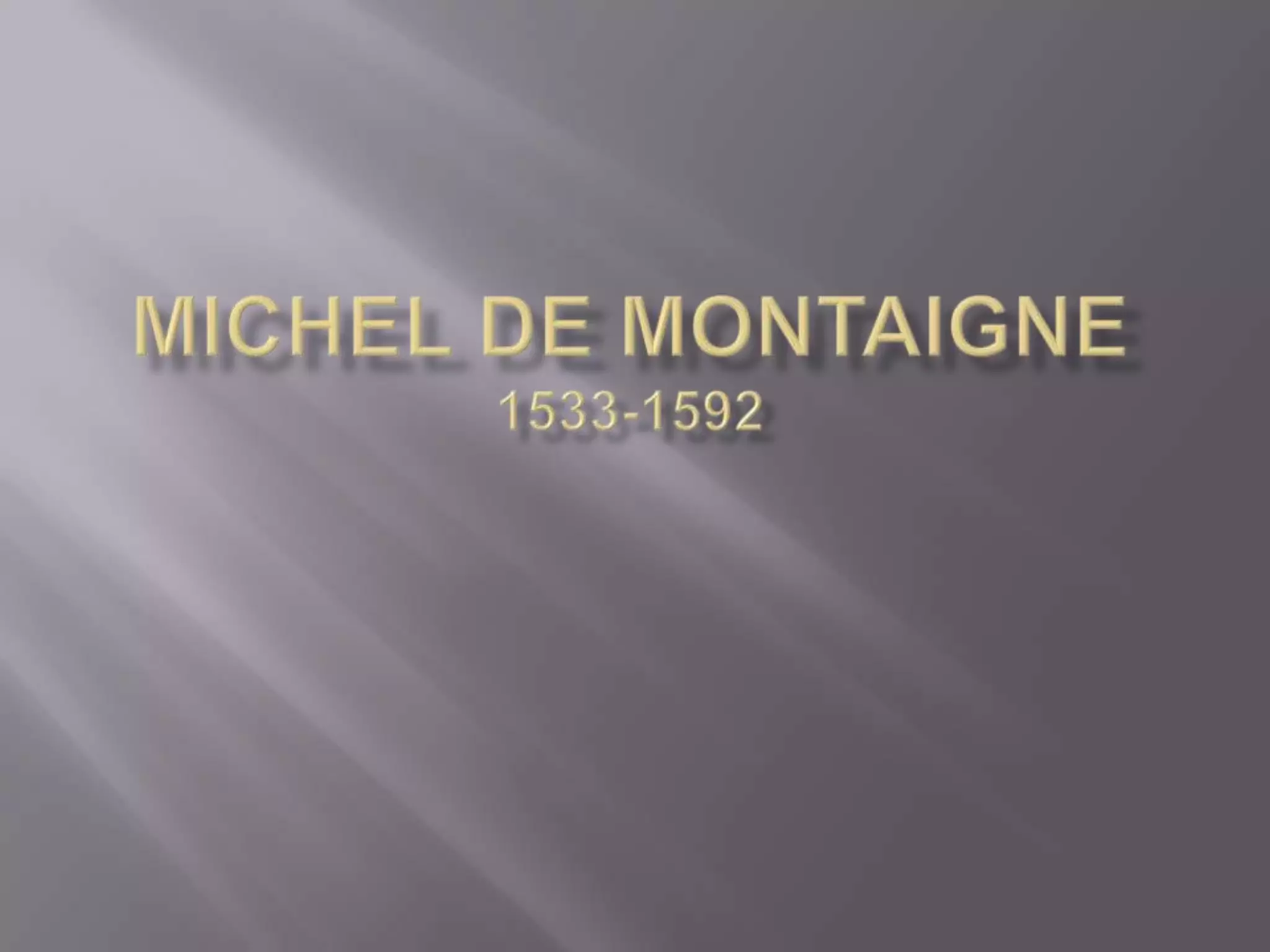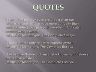 Michel de Montaigne was a 16th century French scholar known as the father of the essay. Through his personal essays, he explored himself and examined his own life experiences and feelings. He used himself as a subject to understand human nature. Montaigne was skeptical of religious dogma and preferred to solve problems without emotion. He is regarded as pioneering the essay as a literary form focused on individual experiences and perspectives.