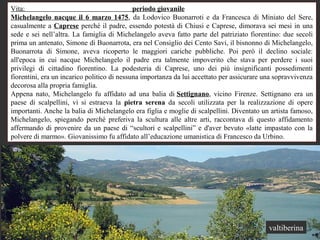 Michelangelo Buonarroti, nato nel 1475, è stato un artista poliedrico, scultore e pittore, con una vita caratterizzata da una straordinaria consacrazione all'arte e importanti commissioni a Firenze e Roma. Dal David agli affreschi della Cappella Sistina, ha saputo fondere superiorità tecnica e profondità espressiva, diventando uno dei massimi esponenti del Rinascimento. Morì nel 1564, lasciando un impatto indelebile sulla storia dell'arte.