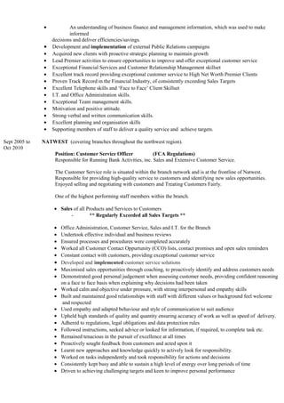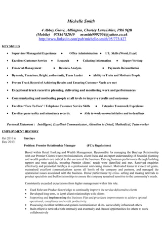 Michelle Smith has over 20 years of experience in retail, customer service, and financial management roles. She has a proven track record of exceeding sales targets and ensuring customer needs are met. Her most recent roles include Premier Relationship Manager at Barclays from 2010 to 2013, where she managed high-net-worth client relationships and motivated teams to exceed goals, and Customer Service Officer at NatWest from 2005 to 2010, where she regularly exceeded all sales targets. She has strong communication, leadership, problem-solving, and organizational skills.