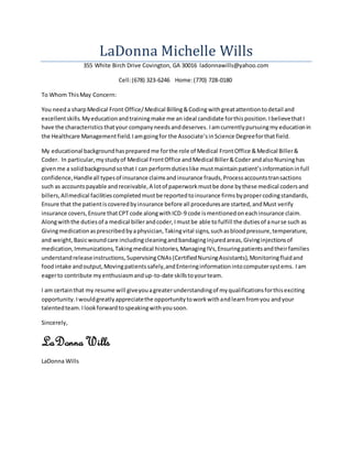 LaDonna Wills is seeking a position as a Medical Front Office/Medical Billing & Coding professional. She has education and training that make her well-suited for the role, including studying Medical Front Office, Medical Billing & Coding, and Nursing. Her background has prepared her to perform duties like maintaining patient information, handling insurance claims and coding, and verifying insurance coverage. She is eager to contribute her skills and enthusiasm to the team.