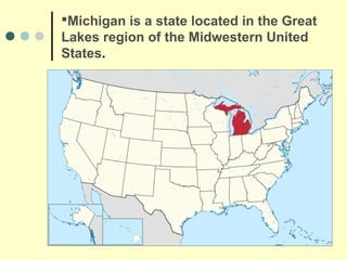 Michigan is a state located in the Great Lakes region between Lake Erie and Lake Superior. It has two peninsulas separated by the Straits of Mackinac and borders four of the Great Lakes. Michigan has over 150 lighthouses, the most of any U.S. state, as well as the largest state park and forest system. The climate varies from warmer in the southern Lower Peninsula to longer, colder winters in the northern parts. Lansing is the capital and Detroit is the largest city, while the automotive industry is centered in Michigan.