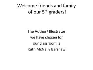 This document provides background information on Ruth McNally Barshaw, a Michigan-based author and illustrator. It outlines that she was born in 1959 in Detroit, Michigan and now lives in Lansing. It details that she illustrates the Ellie McDoodle book series and has also illustrated picture books, comics, and chapter books. The document notes that some of her books have been translated into French and Italian and that she is willing to visit schools.
