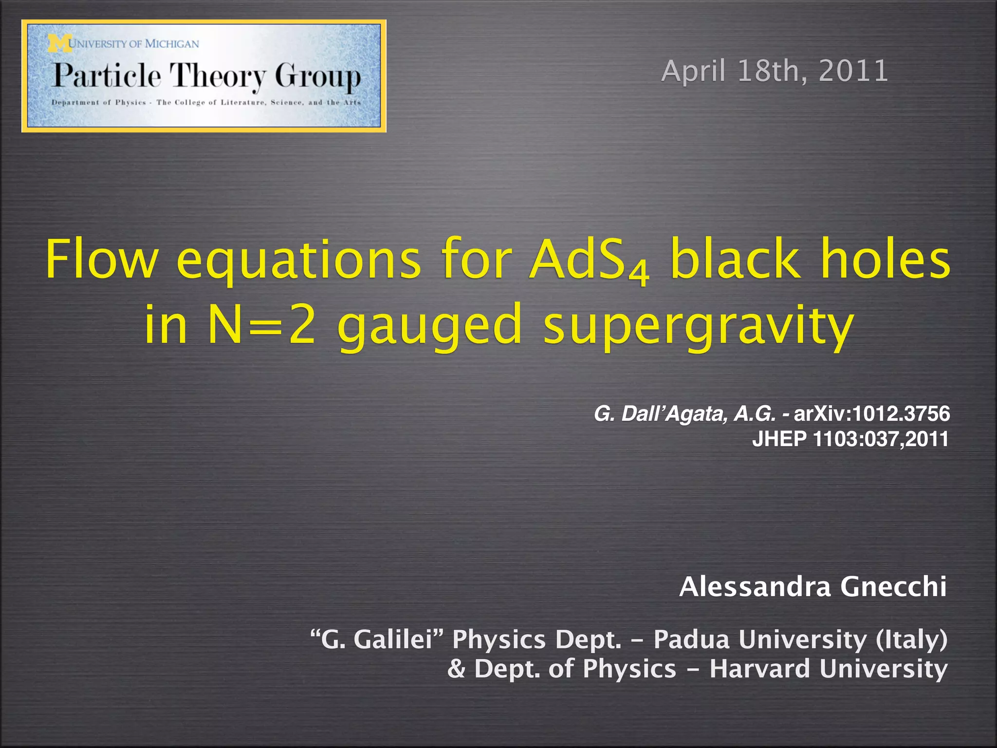 The document summarizes research on black hole solutions in gauged supergravity theories. It discusses how black holes in ungauged supergravity can be described using duality symmetries and extremality. For gauged supergravities, the addition of a scalar potential allows for asymptotically anti-de Sitter spacetimes. The dynamics of scalar fields near black hole horizons are governed by equations modified by gauge field strengths and an effective black hole potential. Specific examples are given in theories with one modulus and special Kähler geometries.