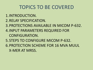 The document discusses configuration of a Micom P-632 relay. It describes the protections available in the relay like differential, restricted earth fault, etc. It provides details of the input parameters required and steps to configure the relay which includes setting date and time, system specifications, selecting protection blocks, output relay configuration, LED configuration, and settings of protections. The configuration is done by taking the relay offline, enabling the required protections and setting their parameters.