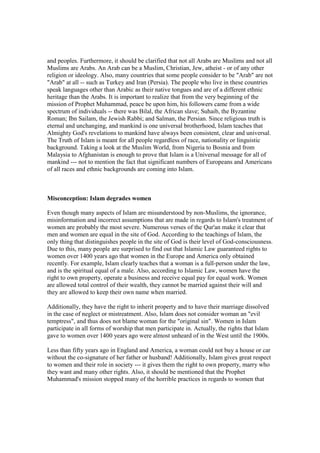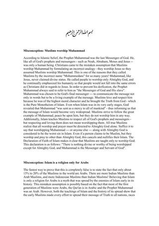 The document discusses several common misconceptions about Islam and Muslims, including that Muslims worship Muhammad, that Islam is only a religion for Arabs, that Islam degrades women, that Muhammad wrote the Quran, and that Muslims hate Jesus. It provides explanations for each misconception, pointing out that Muhammad was a prophet, not divine; that the majority of Muslims are non-Arab; that Islam gave women numerous rights centuries before the West; that Muhammad was illiterate and could not have written the Quran; and that Muslims respect and love Jesus as a prophet of God.