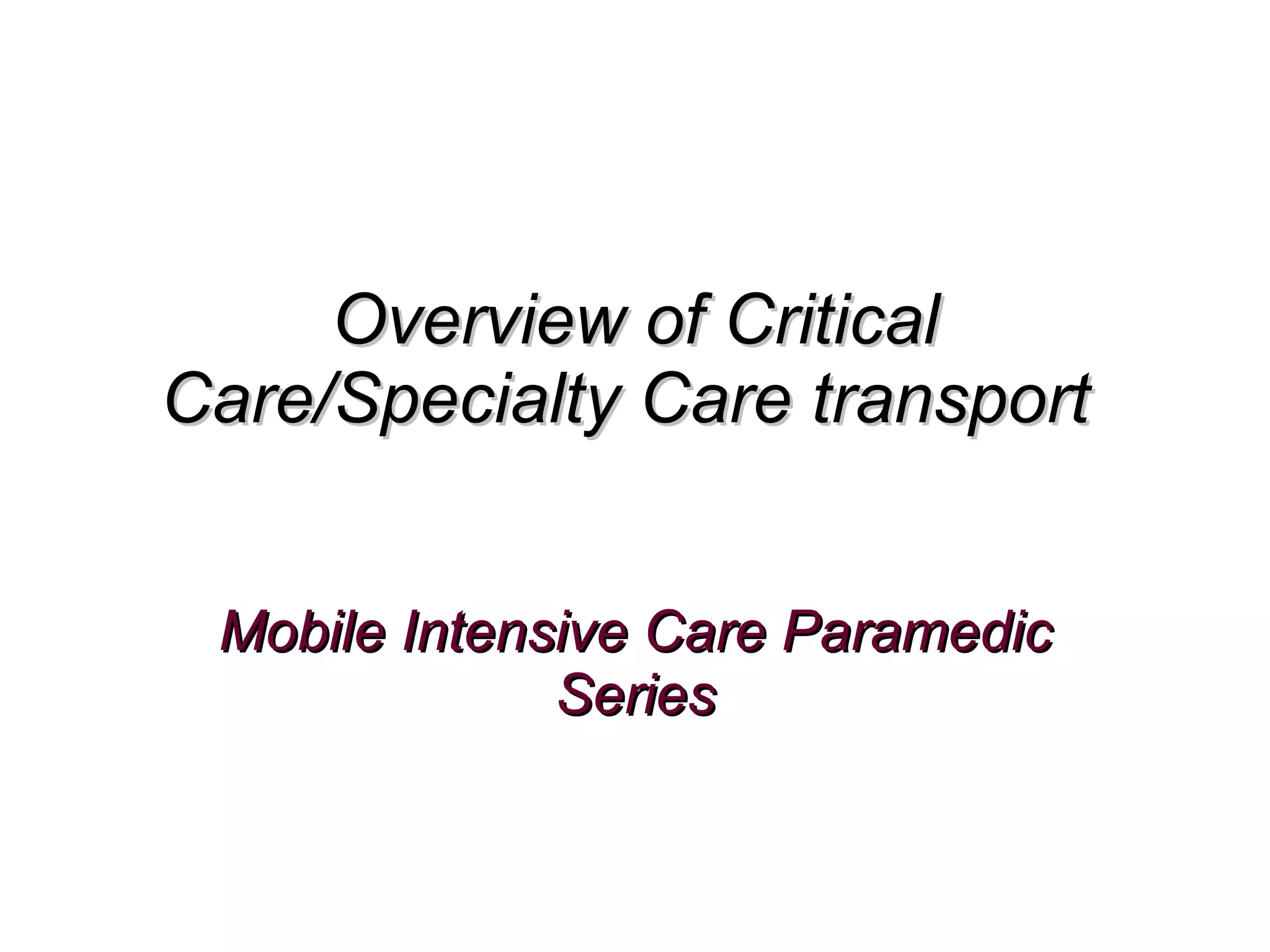 The document provides an overview of the role and functions of critical care/specialty care transport (CCT/SCT) paramedics, highlighting their training, scope of practice, and the differing transport modes available. It discusses the integration of critical care paramedics within the hospital system, emphasizing professionalism, communication, and cooperation with healthcare teams. The current challenges, including legislative influences and standards within the field, are also addressed, showcasing the evolving nature of critical care paramedicine.