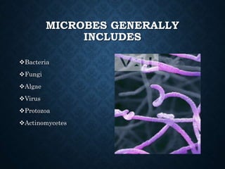 This document provides an overview of microbiology and microbes. It defines microbes as including bacteria, fungi, algae, viruses, protozoa, and actinomycetes. It describes key early discoveries in microbiology including the invention of the microscope, disproving spontaneous generation, and demonstrating that microorganisms cause disease. It also summarizes techniques that advanced the study of microbiology such as microscopy, sterilization, and using pure cultures.