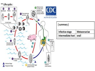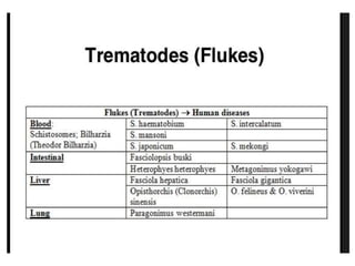 Schistosomes are trematode parasites that infect humans and animals. They have separate sexes unlike other trematodes. The eggs of different Schistosome species vary in shape and features. Schistosome infection occurs through skin penetration by the cercarial stage released from infected snails. Adult worms reside in the mesenteric or bladder veins depending on the species. The pathology results primarily from the host immune response to eggs that are deposited in tissues.