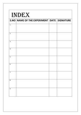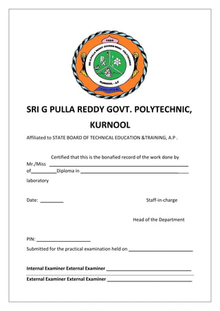 The document outlines a series of experiments conducted at Sri G Pulla Reddy Govt. Polytechnic, Kurnool, focusing on programming and understanding the 8051 microcontroller using the EDSIM51 simulator. Each experiment has a clear aim, tools used, and programming tasks that demonstrate various aspects of the 8051 instruction set, including addressing modes, arithmetic operations, and interfacing with peripherals. Detailed assembly code and expected results for each experiment are provided, showcasing a comprehensive learning approach in technical education.