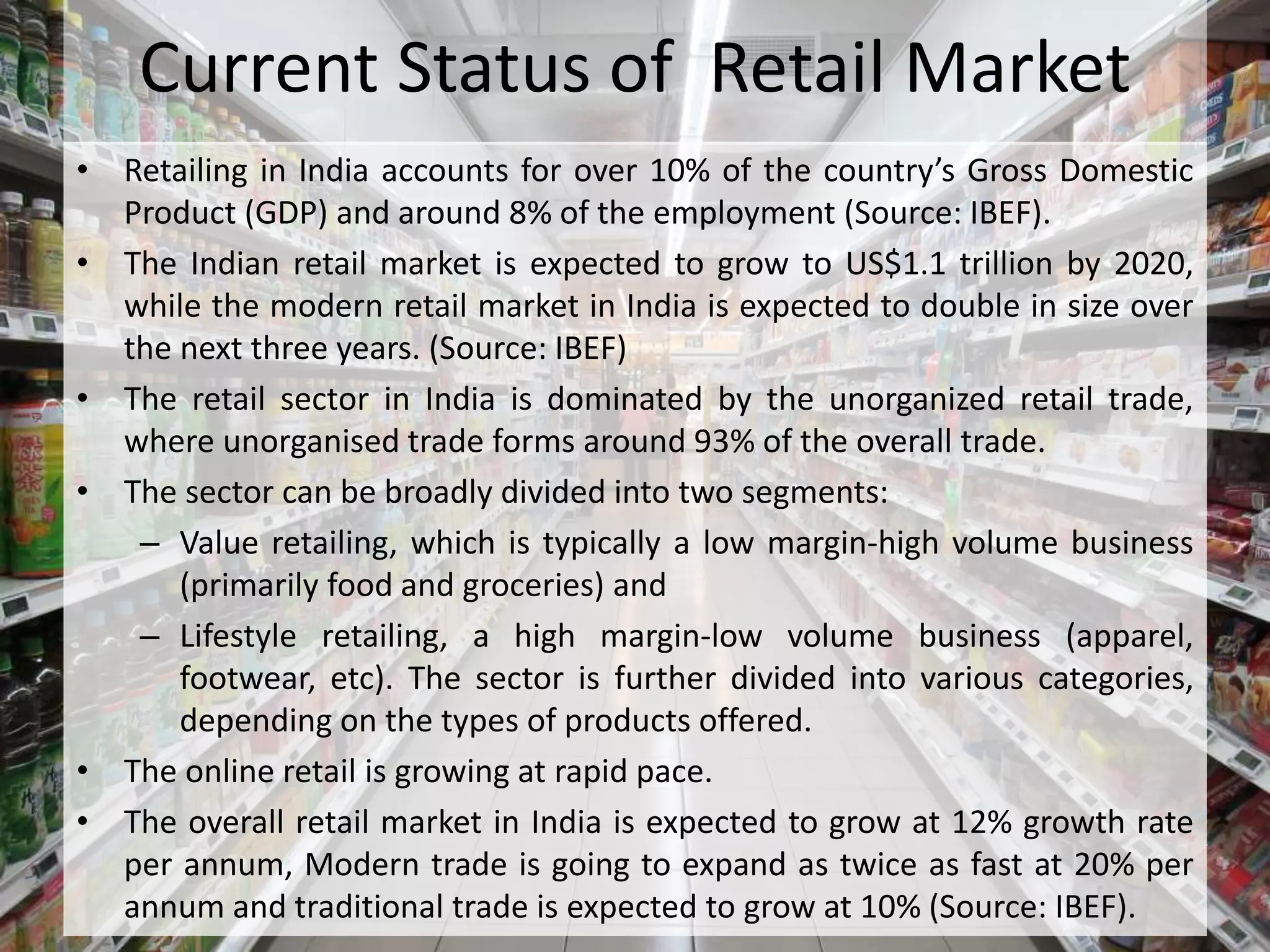 Retailing in India accounts for over 10% of GDP and 8% of employment. The retail market is expected to grow to $1.1 trillion by 2020, with modern retail doubling in size over the next three years. Currently, 93% of retail trade is unorganized. Retail is divided into value and lifestyle segments. Online retail is growing rapidly at 20% annually, while traditional trade is expected to grow at 10% annually. Lower interest rates help organized and unorganized retailers expand through borrowing. Inflation decreases retail demand. India's growing middle class and young urban consumers are increasing retail opportunities.