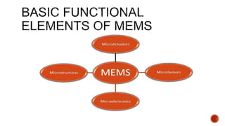 MEMS (Micro Electro Mechanical Systems) technology enables the miniaturization of mechanical structures integrated with electrical circuitry, allowing the creation of multifunctional devices that operate at a micro scale. These devices, ranging from a few micrometers to millimeters, can sense, control, and actuate on micro scales, with applications in gyroscopes, automotive safety, and consumer electronics. Key benefits of MEMS include low power consumption, cost-effectiveness, and compatibility with integrated systems.