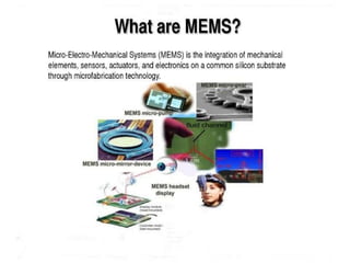 Micro-electro-mechanical systems (MEMS) are miniaturized mechanical and electro-mechanical elements made using microfabrication techniques. MEMS are utilized in various applications, including automotive, biomedical, and chemical fields, with components such as microsensors, microactuators, and microstructures playing crucial roles. The technology allows for integration with electronics, offering advantages like reduced size, lower costs, and improved performance.