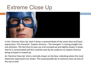 This document discusses and provides examples of various film camera shots and techniques. It includes extreme close-ups showing facial expressions, close-ups of faces, medium close-ups showing emotions, long shots providing full-body views and context, extreme long shots displaying wide setting details. It also covers tracking shots, cut-ins, panning, tilting, zooming, diegetic and non-diegetic sounds, and mise-en-scene arrangements. Examples are primarily from films in The Avengers franchise and showcase different cinematic storytelling tools.