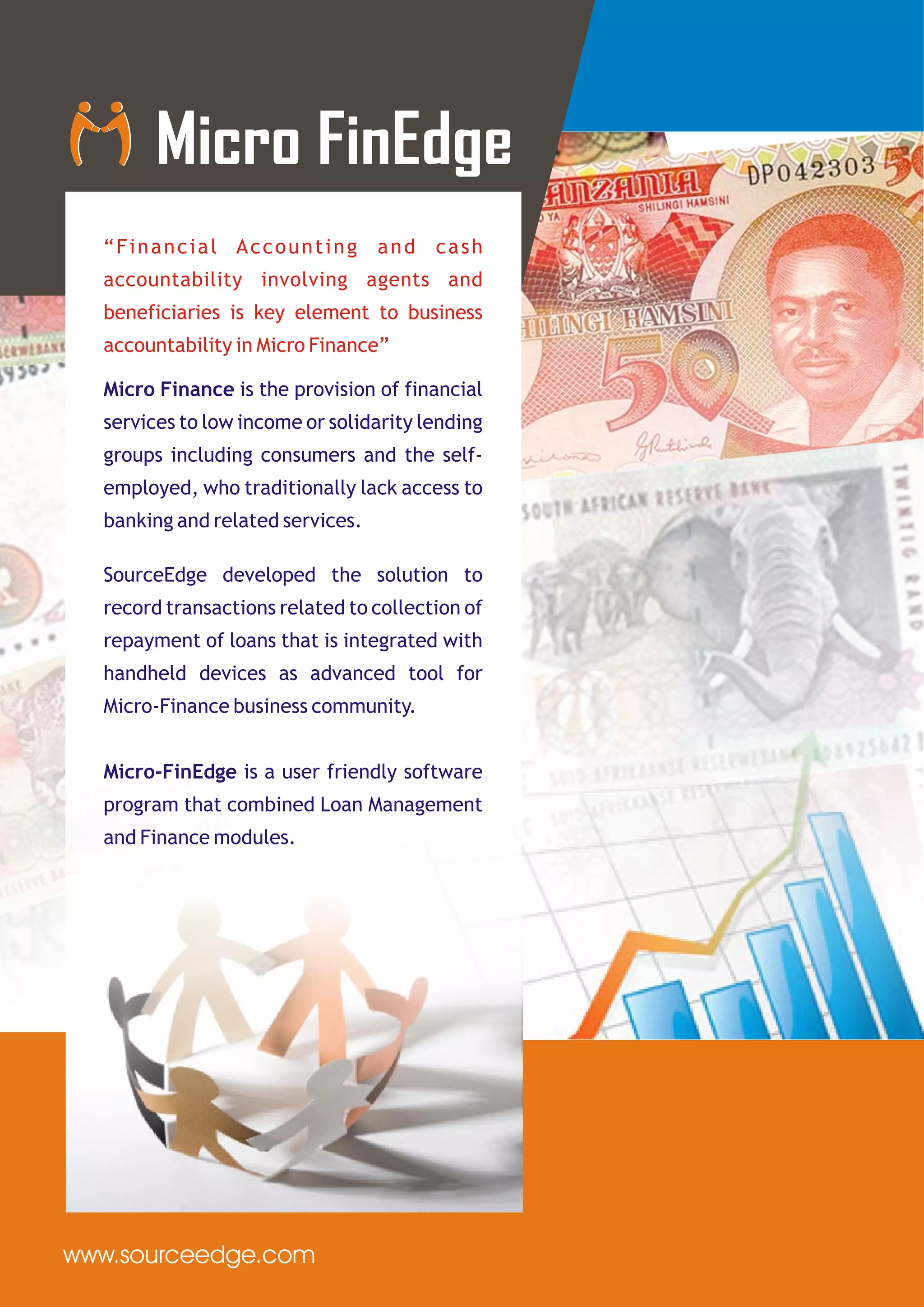 Micro Finedge is a software solution designed for financial management in microfinance, enabling agents to record and manage loan transactions via handheld devices. It includes features for loan collection, repayment tracking, and client registration, facilitating access to financial services for low-income groups. Sourceedge, the provider based in India, offers a range of IT solutions and has a global presence across multiple countries.