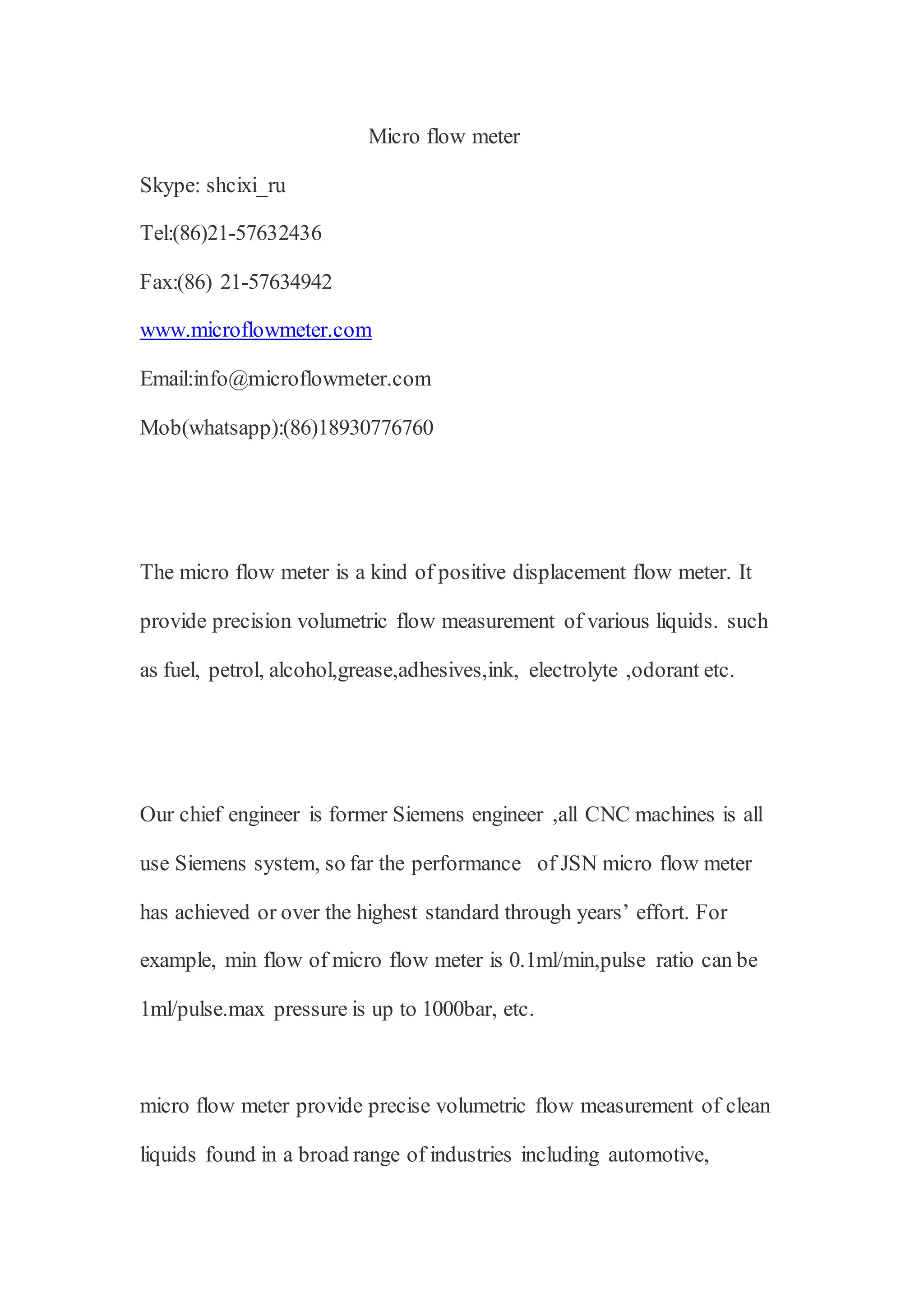 The micro flow meter is a precision positive displacement flow meter designed for accurate volumetric measurement of various liquids, including fuels and adhesives. It features a compact design, high accuracy, and the ability to measure both high and low viscosity liquids, with performance specifications such as a minimum flow rate of 0.1 ml/min and maximum pressure of 1000 bar. Applications span multiple industries, and customization options are available for different temperature and pressure requirements.