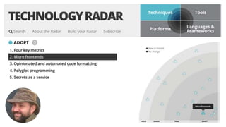 Kleyson Prado, a coder from Brazil who works for SkipTheDishes, discusses micro frontends. Micro frontends allow independent implementations of different subdomains using the same or different technologies. They avoid sharing logic between subdomains and each is owned by a single team. Micro frontends are about breaking large, complex applications into smaller, independent pieces that can operate and evolve separately with minimal coordination. Integration approaches include server-side templating, runtime integration via web components or JavaScript, and build-time integration through a monorepo.