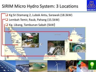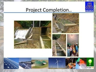 This document summarizes the key aspects of micro hydro electric projects for rural electrification. It discusses that micro hydro projects have minimal environmental impact and can operate continuously using small amounts of flowing water without needing a large dam. The document provides examples of suitable head heights available in various locations in Kerala. It also outlines the components, design considerations, power estimations, and cost analysis of typical micro hydro projects. In conclusion, it states that micro hydro is a feasible solution to provide power to remote areas and many government policies support their development.