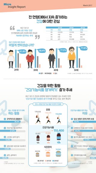 Micro Insight Report 3월호에서는 전 연령층에서 꾸준한 관심을 보이는 건강에 대해 살펴보았습니다. 건강을 위해 하는 활동과 30대의 건강 챙기기, 5월 가정의 달 선물 등을 알아보세요!