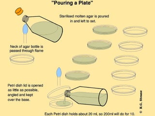 The document discusses various microbiology techniques for culturing microbes including inoculation, isolation, incubation, inspection, and identification. It describes how to produce pure cultures through methods like streak plating and describes different types of culture media including solid, liquid, enriched, selective, and differential media. The goals are to transfer microbes to produce isolated colonies, grow them under proper conditions, observe characteristics, and identify organisms through comparing data.