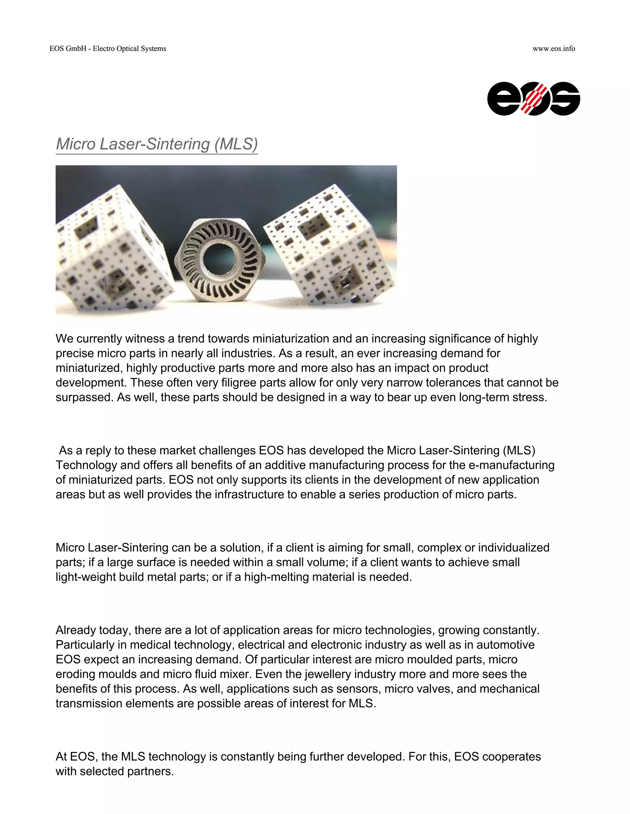 EOS has developed Micro Laser-Sintering (MLS) technology to meet the growing demand for miniaturized, highly precise micro parts across many industries. MLS allows for the additive manufacturing of very small, complex metal parts with tight tolerances and the ability to withstand long-term stress. EOS supports both the development of new MLS applications and the series production of micro parts. MLS can produce small, lightweight metal parts for applications requiring a large surface area within a small volume or the use of high-melting materials. Industries such as medical, electronics, automotive, and jewelry see increasing potential for MLS in applications including micro molds, fluid mixers, sensors, and mechanical transmission elements. EOS continues to advance