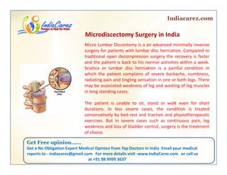 Micro lumbar discectomy (MLD) is a minimally invasive surgical procedure for lumbar disc herniation, allowing for faster recovery compared to traditional surgery, with many patients returning to normal activities within a week. The treatment is recommended for those experiencing severe pain or loss of function after conservative treatments fail. Interested individuals can obtain a free expert medical opinion by emailing their medical reports to indiacarez@gmail.com.