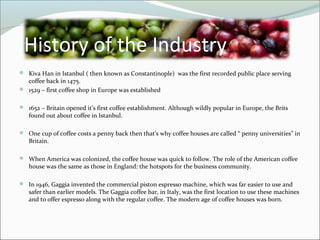 This document summarizes the history of the coffee industry and compares observations of two coffee shops, The Coffee Bean and Tea Leaf and Starbucks Coffee, located in Power Plant Mall in Rockwell, Philippines. It describes the shops' locations, customer demographics, menus, pricing, and customer service. Key findings are that Starbucks has a better location, more personalized service, and wider target market. The recommendation is for The Coffee Bean to explore additional products like a coffee bar and flavored coffee candies to gain a competitive advantage.