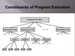 The document decomposes the functioning of a processor into elementary operations called micro-operations. It describes the basic elements of a processor including registers, data paths, an ALU, and a control unit. The control unit sequences and executes micro-operations to perform the fetch, indirect, execute, and interrupt cycles of the instruction cycle. The control unit uses a clock, instruction register, and flags to determine the timing and sequencing of micro-operations.