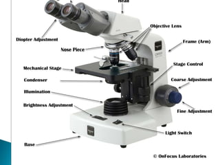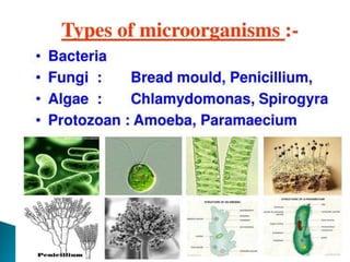 This document discusses microorganisms and microbiology. It defines microorganisms as organisms that can only be seen with a microscope, and notes that they are found everywhere and can be both useful and harmful. It identifies the five main types of microorganisms as viruses, bacteria, algae, protozoa, and fungi. It also defines key terms like microbiology, microscope, microbiologist, and different types of microorganisms like bacteria, parasites, saprophytes, and viruses.