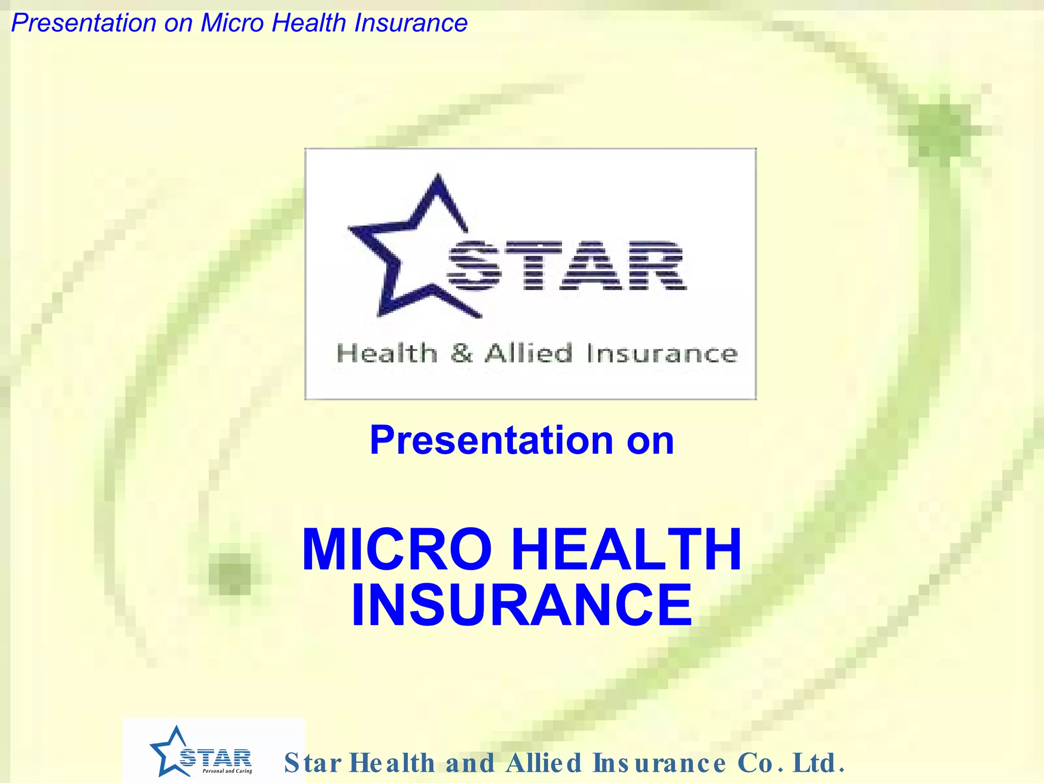 This document provides an overview of micro health insurance coverage offered by Star Health Insurance. It covers hospitalization expenses for illness, disease, or accidents for individuals aged 5-50 years. Coverage amounts of Rs. 10,000, Rs. 20,000, and Rs. 30,000 are offered. The document outlines allowable room rates, fees, and procedure costs based on coverage level. Premium rates vary from Rs. 95-500 based on age. The policy also provides certain tax benefits and health services. Exclusions include pre-existing conditions, cataracts, and injuries from war. Claims procedures differ for network versus non-network hospitals.