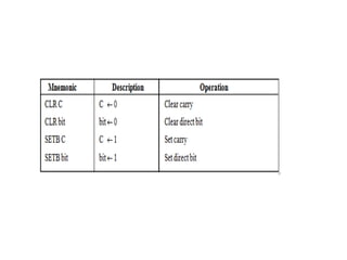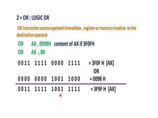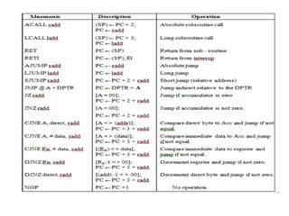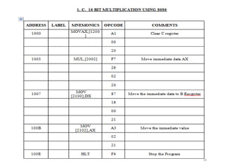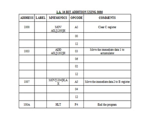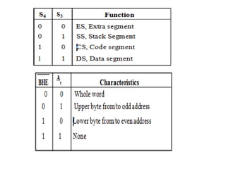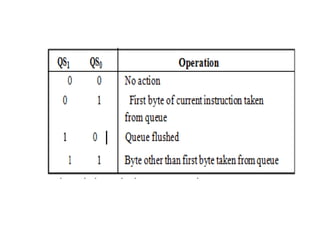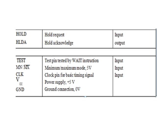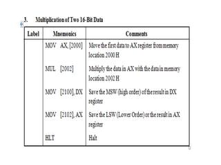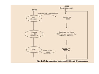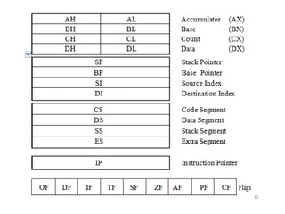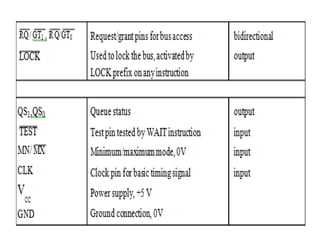 The document provides a comprehensive overview of the 8086 microprocessor, detailing its architecture, features, and operational components such as the bus interface unit and execution unit. It describes the various registers, addressing modes, and instruction sets, highlighting their functions and uses in programming. Additionally, the document explains the arithmetic, control transfer, and data manipulation instructions integral to operating the 8086 microprocessor.