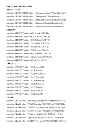 This document describes a micro project to create a simple Oracle database to store course enrollment data for a university. It involves designing tables to model student, class, enrollment and other data; populating the tables with sample data; writing SQL queries to retrieve and analyze the data; and creating PL/SQL functions and procedures to generate reports on departments, students, and faculty. Key tasks include creating tables with primary keys and foreign keys, inserting records, writing queries to retrieve aggregated data on departments and their faculty/students, creating views to display related data, and procedures to output formatted reports.