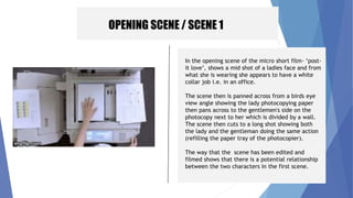 The micro short film 'Post-It Love' tells the story of a shy office romance developing between a male and female coworker. Over the course of 9 scenes, the two characters exchange smiling glances but are too shy to speak. They begin secretly leaving notes for each other using post-it notes, creating smiling faces, hearts, and drawings to express their affection without directly confronting each other. Their shy exchanges escalate until the final scene, where the male reveals a large collage of their faces, establishing that their mutual interest is now out in the open.