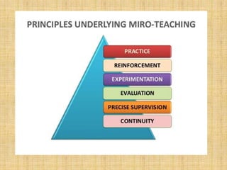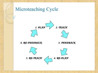 This document discusses microteaching, a teacher training technique where teachers review recordings of short teaching sessions to get feedback. Microteaching was developed in 1961 at Stanford University. It involves teaching small units of content for 5-10 minutes to small groups of students. The goals are to train new teachers and improve skills of experienced teachers. Microteaching has advantages like modifying teacher behavior, developing skills, and improving practice through individualized training and feedback. However, it only focuses on skills and may not represent normal classroom teaching.